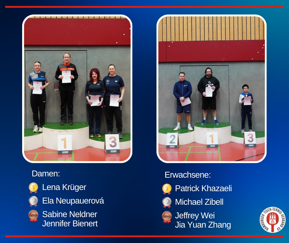 In den Doppelkonkurrenzen der Erwachsenen konnten nach zwei anstrengenden Turniertagen Jia Yuan Zhang und Patrick Khazaeli bei den Herren sowie Annika Friese und Lena Krüger bei den Damen den Titel erringen. Im Mixed bewiesen Jennifer Bienert und Kai Enno Kleffel einmal mehr ihre außergewöhnliche Harmonie: Mit einer eindrucksvollen Titelverteidigung ohne Satzverlust sicherten sie sich bereits zum dritten Mal in Folge den Hamburger Meistertitel.