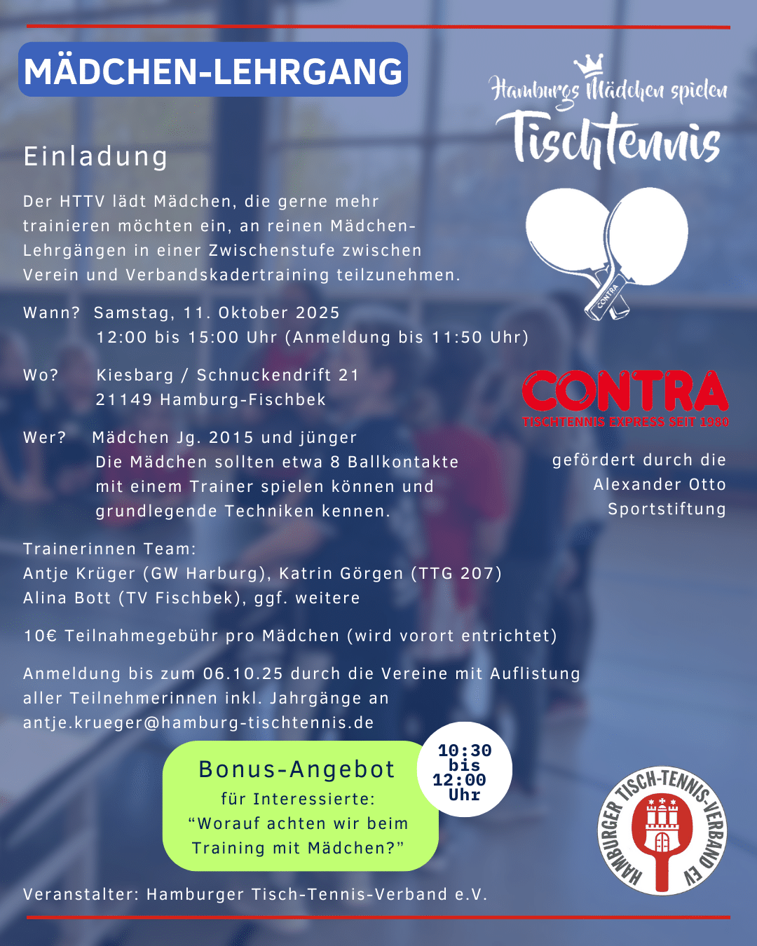 Am 11. Oktober findet der nächste Mädchen-Lehrgang des Hamburger Tisch-Tennis-Verbandes in Fischbek statt. Es ist bereits der sechste Lehrgang dieser Art und die Mädchen freuen sich schon darauf.